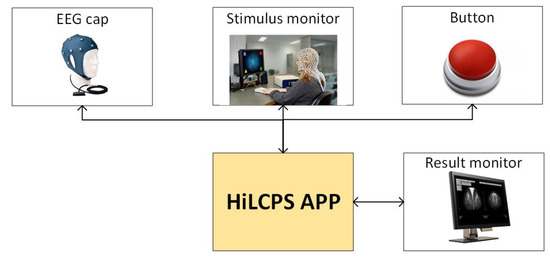 An EEG system, focused on diagnostic/therapeutic tasks with the ADHD context, which is built with the HiLCPS framework, could be structured as depicted in Figure 4. Here, an ERP test is implied. The subject is presented a sequence of images. If a specific image is displayed, the subject has to press a button. The EEG signals are captured by an EEG cap and the corresponding controllers. Through the stimulus monitor, the image sequence is displayed. The subject can signal the odd picture via the button. The conductors of the test can monitor the result with the result monitor.