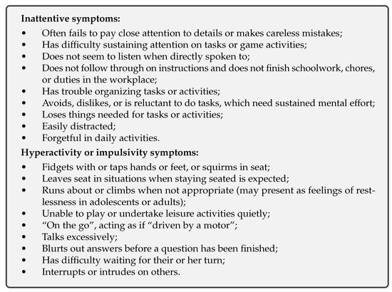 Diagnosis of ADHD is difficult, partially because its presence is often accompanied by other mental disorders [24,25,26]. Additionally, the occurrence of the disorder is not connectable to single bio-markers, such as a sole defective gene [27]. The most significant circumstance for the lack of a concise ADHD diagnosis is the limited knowledge about the brain mechanisms that lead to the disease. Animal models suggest that impairments in some brain signal transmission processes lead to the symptoms of ADHD [28,29]. However, it is not yet completely clear to what extent those animal models can be translated to humans [19]. In order to achieve at least a minimum level of consensus and comparability between cases, standardized criteria are used to determine if a patient is affected by ADHD. Popular instances of such criteria are classifications systems, such as DSM5 or ICD10. For example, a positive diagnosis via DSM5 requires the patient to show at least six of the behaviors described in Listing 1 from either the “Inattentive symptoms” or “Hyperactivity or impulsivity symptoms” sections. The patient must not be older than the age of 16, and the symptoms have to have appeared before the age of 12. Additionally, the symptoms must not be better described by other diseases. The experienced symptoms have to lead to impairments in at least two social settings (e.g., school, domestic life, or workplace). Note that other criteria are applied to patients older than the age of 16. However, these shall not be further elaborated here, as this paper focuses mainly on the diagnosis of ADHD in children.