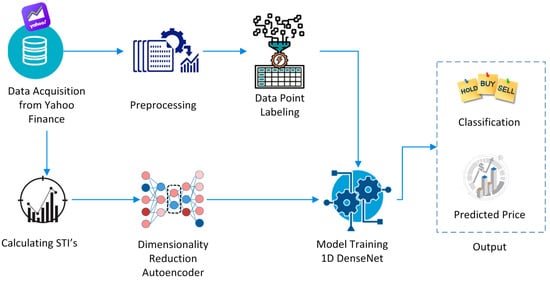 As already mentioned, this work focuses on predicting the stock market closing prices based on the STIs by using 1D DenseNet, followed by dimensionality reduction using an autoencoder. We first gathered ten years of financial stock trading data from Yahoo Finance, then calculated eighteen STIs from these data and then fed these STIs, along with the stock trading data, into the 1D DenseNet model after dimensionality reduction of the STIs from the autoencoder. Finally, the computed feature set obtained from the 1D DenseNet framework was used as input for training the softmax layer residing in the 1D DenseNet framework for short-, medium-, and long-term prediction of the closing stock prices. Although the prediction of short- and medium-term predictions in stock data are more desirable in the stock market, the long-term prediction is also significant as a prediction of the direction of stock prices and is normally more important for value investing in the long term, resulting in wiser decisions in short- and medium-term perspectives. Based on the predicted trends of the stock prices, our model provides suggestions to the user using one of three signals, i.e., buy, sell, or hold.