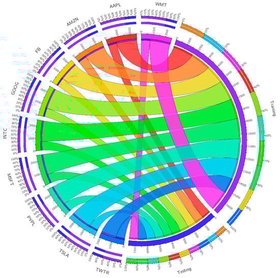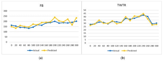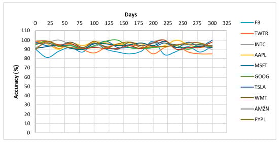 Closer predicted results to the actual line present a more accurate prediction. The performance of the proposed model regarding accuracy is presented in Figure 5, Figure 6, Figure 7, Figure 8 and Figure 9. Additionality, an accuracy timeline for 300 trading days is presented in Figure 10. As expected, the model performance for the stock named FB was slightly degraded due to fewer training data for the said stock. As discussed earlier, this slight degradation in model training for the said class was due to the fact that FB and TWTR started appearing in the US stock markets from May 2012 and July 2013, respectively.