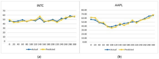 Actual and predicted price graph for (a) INTC and (b) AAPL.