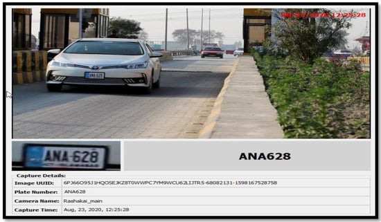 After configuring and obtaining the live traffic stream on the highway, various video and image-processing algorithms such as the open-source Library OpenCV, PyTesseract, Open ALPR, Background Subtraction Algorithms, Plate Recognizer API’s, haar cascade classifier and PixelLib object detection, and JSON libraries are used to generate the required JSON file. This file contains all vehicle information, such as a still photo, the license plate, and the vehicle’s roadway entry and exit timings, as shown in Figure 3 and Figure 4.