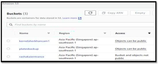 Three buckets are created in Amazon Simple Storage Service (Amazon S3), which could be increased with increases in the number of cameras connected to the system. One of the buckets is used for the entrance point data receiver, and another for generated results from the exit point, while the third bucket is used to back up all captured license plate data. A list of the buckets is presented in Figure 5.