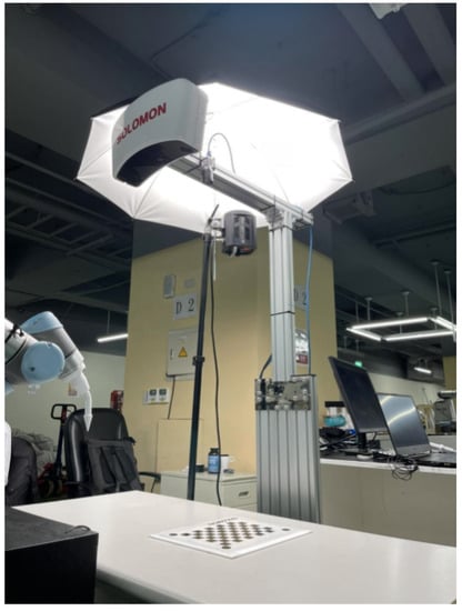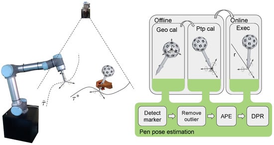 We divide the evaluation of our system into following stages: geometry calibration, pentip calibration, inference accuracy including static noise and dynamic analysis. To facilitate the experiments, an industrial grade Basler acA1920-155um camera with 8 mm lens is used. This camera configuration provides images with resolution of . It has a CMOS sensor with size 11.3 mm × 7.1 mm with a 1/1.2 in format. With fast motions of the pen under an operator’s normal use, a light setup is necessary which we use a Skier Sunray 200 CUBE dual color temperature LED light with 200 W power, 19,200 lm, the full color temperature range can maintain the real 200 W brightness, high color rendering Color Rendering Index (CRI) 95, color temperature 3000–5700° K. A robot needs to replicate the taught path which we deploy a Universal Robot UR5 robot weighing 18.4 kg, with a 5-kg payload. Its reach is 850 mm and each joint range is from to . The overall setup is shown in Figure 9: