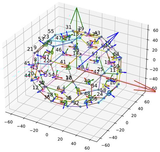 The Truncated IcosaHedron (Wikipedia contributors, “Truncated icosahedron”, Wikipedia, The Free Encyclopedia, https://en.wikipedia.org/w/index.php?title=Truncated_icosahedron&oldid=1017030761 (accessed on 4 May 2021)) geometry is constructed from Icosahedron (Wikipedia contributors, “Icosahedron”, Wikipedia, The Free Encyclopedia, https://en.wikipedia.org/w/index.php?title=Icosahedron&oldid=1021031901 (accessed on 4 May 2021)) with the 12 vertices truncated such that one-third of each edge is trimmed at each of both ends. It generates a polyhedron consisting of 32 surfaces (12 pentagonal and 20 hexagonal faces), 60 vertices, and 90 edges. The coordinate of the truncated icosahedron is defined at the center and vertices are a combination of 3D points belonging to the orthogonal rectangles , , and the orthogonal cuboids , , along with the orthogonal cuboids , , , where is the golden mean. Using one verifies that all vertices are on a sphere, centered at the origin, with the radius squared equal to . The edges have a length of 2 mm. We scale edge length into 25 mm for the proposed truncated Icosapen design as shown in Figure 2.