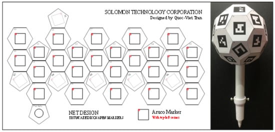 ArUco markers were originally developed by S.Garrido-Jurado [11]. These markers are highly reliable under occlusion when they are used in a set, e.g., ArUco, ChArUco board [12]. A single ArUco marker is a binary square composed of a wide black border and an internal binary matrix to identify its identifier (ID). Currently, there are more than 25 dictionaries of markers that are widely applied in various applications with different binary block sizes (, , , ). The binary grid size of the marker type is proportional to the possibility of the maximum number of generated markers. From truncated Icosahedron design, a pentagonal surface is utilized to mount the pen, as shown in Figure 3, only 31 surfaces (11 pentagonal and 20 hexagonal faces) are available to glue markers. In this study, the ArUco dictionary DICT_4X4_50 (grid , the maximum generated marker is 50) is used to generate markers with the IDs from 1 to 31. Since the edge length of the truncated Icosahedron geometry is 25 mm, the real marker length is approximately 22 mm which is quite small to detect at a far distance. Therefore, the binary block will increase the detail of the ArUco image at far distances compared to the others. The center of each marker is aligned with the center of the pentagonal or hexagonal surfaces, as shown in Figure 3. The full design of the Solpen Net is illustrated as Figure 4