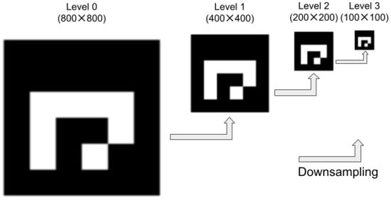 All inlier corner points obtained from the APE approach are used to localize zero paddings of the detected inlier ArUco markers by scaling with a factor as in the original design shown in Figure 3. Normalization is first applied to scale min-max pixel values inside zero-padding regions into range (0–255). The bilateral filter is then applied to remove noise and to preserve a sharp edge with a gradient effect. These intensity pixels at the gradient transition region are then aligned with the edge gradient pixels built up from the Gaussian pyramid reconstruction so that the total error of intensity pixels is minimized.