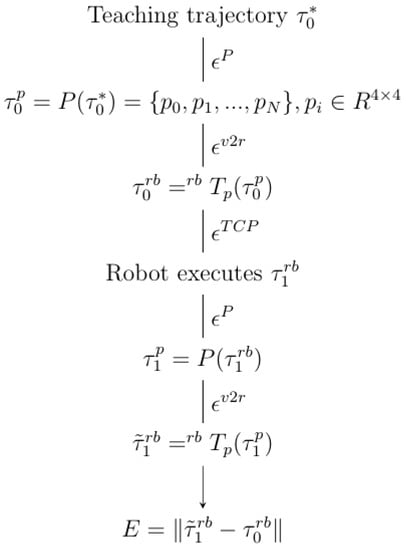 With the aim of an efficient robot teaching device, our evaluation goals should involve an actual use case of a robot teaching by an operator and, under such a circumstance, the required accuracy can be attained regardless of the gross error of the overall system. In this particular multistage setup, at stage (1), an operator would use the pen in a free and comfortable way to teach the robot performing a teaching trajectory . At stage (2), The trajectory is captured and estimated by the camera to result in the teaching trajectory in the camera c.s. which consists of a sequence of poses where . This estimation accumulates an error . At stage (3), the previous trajectory is transformed to robot c.s. to have by the calibrated vision-to-robot (V2R) which is hindered by the error . At stage (4), the robot is commanded to perform the given trajectory with its attached tool (a TCP-calibrated Solpen) which likely has an error . At the final stage (5), the executed robot trajectory is estimated by the algorithm to have trajectory in pen c.s. . The accuracy evaluation relies on the discrepancy between and at stage (5) under a chosen metric. We picture this evaluation in the diagram in Figure 8.