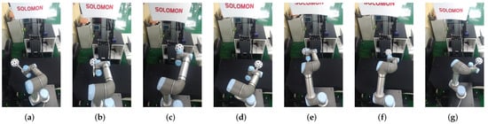 Vision-robot calibration leveraging Solpen. (a–g) The UR robot with Solpen attached as its TCP is moved to seven points to collect calibration information.