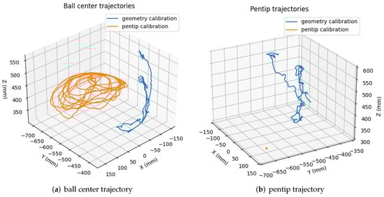 Pen position trajectories w.r.t. robot base coordinate in geometry and pentip calibration.