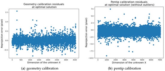 Equation (6) is therefore formed as a nonlinear least square problem and is solved by an available optimization solver. The implementation of geometry calibration is facilitated by the pipeline of Figure 7a.