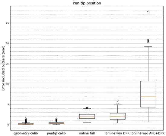 In order to inspect more specifically the distribution of the residuals, we use box plots in Figure 13, which also attempts to visualize the accuracy under different modes of the estimation pipeline, namely, without DPR and without both APE and DPR. The plot visualizes and affirms the effectiveness of the optimization stages of the estimation pipeline. Namely, after pen calibration is done, when estimation is executed upon input streams (i.e., “online” processing) and the full pipeline, i.e., having both APE and DPE merely approximates the one with APE alone. The performance, however, decreases rather clearly when both APE and DPR are not enabled (shown at the right most box of Figure 13).