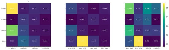 As can be seen from Figure 14, within the working range less than 100 cm, lighting plays a more significant role in estimation accuracy. The right-most column with 99% light power generally exhibits the highest accuracy over all three axes and a reversed trend can be seen in the weakest light power column. However, column-wise, accuracy improvement is not obvious but rather shows a random behavior. Among the components, the error in the Z-component appears to be more prevalent. Generally, at the most challenging condition (100 cm, 25% light), the accuracy still achieves sub-millimeter [0.475, 0.189, 0.446].