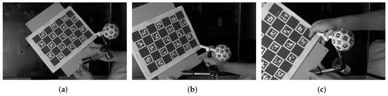 Dynamic experiments of ChArUco board versus Solpen. The setup and some discrete frames (a–c).