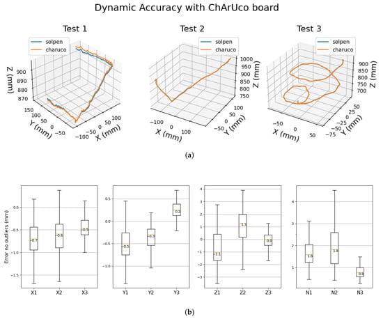 Dynamic error analysis—trajectory of ChArUco board origin versus pentip. (a) Trajectory illustration. (b) Dynamic error box plots for the trajectories. The first three box plots are the per-axis errors and the last plot represents the norm error of the tests.