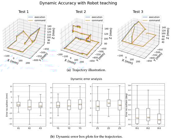 As shown in Figure 17a, the trajectory of command which was taught by an operator and the trajectory of robot execution are plotted to visualize the discrepancy in a more intuitive manner. The trajectories are drawn in such a way that they span widely and randomly within the working range of the pen. As can be seen, the execution trajectories closely track the previously taught trajectories. To inspect this error more carefully, box plots are drawn for both translation and rotation errors in Figure 17b. The translation errors are computed along each axis as with e represents execution and c does for command. Overall, the per-axis translation errors are roughly 2.79 mm, 1.09 mm, and 1.44 mm respectively. The rotation errors are computed from angle-axis formulation with which a pure translation would have an identity matrix . Otherwise, this error rotation matrix can be converted to a rotation vector using the Rodrigues formula.