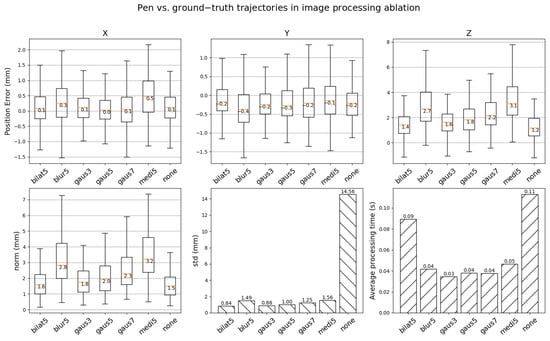 Image processing ablation. The position error between the pen tip and the ChArUco board origin is verified with multiple image filtering algorithms including bilateral (), normalized box (), Gaussian (, , ), median (), and without such blurring (). The first row depicts the average error per-axis using the box plots without outliers, whereas the second row is reserved for the average norm error, i.e., all axes, standard deviation, and processing time.