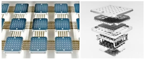 A set of D1 Dojo processors (2021) for Tesla’s AI autopilot, designed to work in neural networks (left). The design of the processor, consisting of various plates: heat sink, computation, and power and control (right).