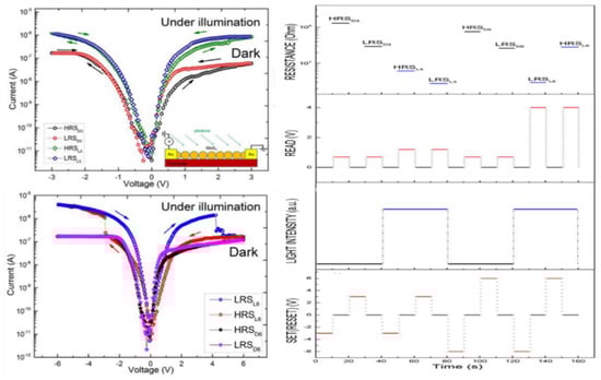Current–voltage characteristics of the MoS2 photomemristor polarized at 3V (left, top) and 6V (left, bottom) and switching diagrams (SET, RESET) of memristive states (HRSD3, HRSL3, LRSD3, LRSL3, HRSD6, HRSL6, LRSD6, LRSL6) with electrical and optical excitation [15].