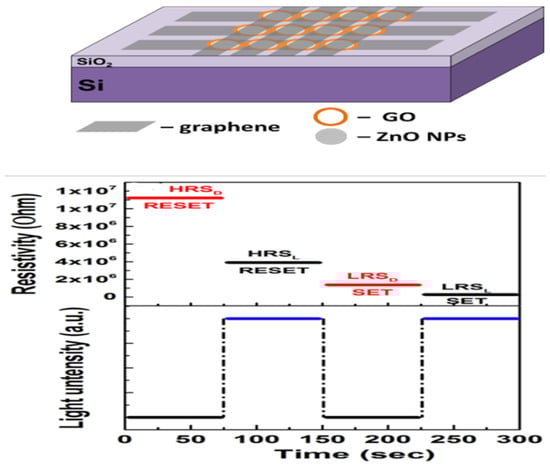 Schematic diagram of a graphene/GO-based photomemristor matrix on a Si/SiO2 substrate, formed by photocatalytic oxidation in the regions near ZnO nanoparticles (ZnO NPs) and a switching diagram (SET, RESET) of high-resistive (HRS) and low-resistive (LRS) states in the dark (HRSD, LRSD) and with photoexcitation (HRSL, LRSL) [20].