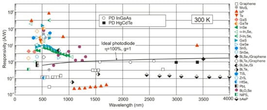 Spectral sensitivity of photodetectors made of 2D layered materials at 300 K. The black line shows the spectral sensitivity of an ideal photodiode with 100% QE and g = 1. The sensitivity of commercially available photodetectors (InGaAs and HgCdTe photodiodes) is presented for comparison [21].