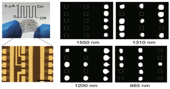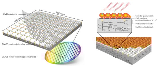 CMOS-integrated circuits, which are at the heart of the microelectronics technological revolution, enable the creation of compact and inexpensive microelectronic circuits and imaging systems. However, the use of this platform in applications other than microcircuits and visible light cameras is hampered by the difficulty of combining non-silicon semiconductors with CMOS technology. Monolithic integration of a CMOS-integrated circuit with graphene acting as a high-mobility phototransistor was demonstrated in 2017 [22]. The high-resolution CMOS broadband image sensor can be used as a digital camera that is sensitive to ultraviolet, visible, and infrared light. The demonstrated graphene-CMOS integration is critical for incorporating 2D materials into next-generation microelectronics, sensor arrays, low-power integrated photonics, and CMOS imaging systems spanning visible, infrared, and terahertz frequencies. An example of such an alignment is shown in Figure 6, which shows arrays of broadband image sensors based on the integration of graphene and CMOS. The integration of CMOS ICs with graphene and quantum dots (QDs) allows the creation of a broadband image sensor with high resolution and sensitivity in the UV, visible, and IR ranges from 300 to 2000 nm. Due to the high mobility of graphene (here ∼1000 cm2 V−1 s−1), this photoconductor structure exhibits an ultrahigh gain of 108 and a sensitivity above 107 AW−1, which is a significant improvement over photodetectors and imaging systems based only on QDs [22]. The large signal and low noise result in a measured detectivity for prototype photodetectors above 1012 cm √HzW−1 (Jones). This large detectivity, spectral sensitivity in the 300–2000 nm range, and the recently demonstrated switching time of 0.1–1 ms clearly support the applicability of this approach for infrared imaging. In addition to the array of light-sensitive pixels, the imager contains a series of blind pixels that are used to subtract the dark signal because the photo detectors are electrically biased. Note that here the spectral range is determined by the material and size of the QDs, but this approach can be generalized to other types of sensitizing material in order to expand or adjust the spectral range of the sensing element. Monolithic integration of graphene with CMOS image sensor arrays allows for a wide range of optoelectronic applications such as low-power optical data transmission, integrated photonics, high-frequency electronics and sensor arrays, and compact and ultra-sensitive sensor systems for AI. Graphene-based image sensors can be designed to operate at higher resolutions, over a wider wavelength range. Unlike modern hybrid imaging technologies (which are not monolithic), monolithic integration with 2D materials does not face fundamental limitations in terms of decreasing the pixel size and increasing the thermal imager resolution. Ultimately, the limiting factor will be the formation of the pattern and contact with graphene, that is, lithography. Consequently, competitive multi-megapixel image sensors with a pixel pitch of about 1 μm are already within reach.