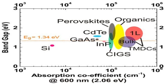 Two-dimensional semiconductors provide unique opportunities for optoelectronics due to their layered atomic structure and optical and electronic properties. To date, most of the applied research in this area is focused on field-effect electronics, as well as photodetectors and LEDs. The photonic and electronic design of a 2D semiconductor photovoltaic system represents a new direction for ultra-thin, efficient solar cells with applications ranging from portable and ultra-lightweight optoelectronic battery power generation to intelligent photosensors. The absorption of light in the active layers of a photovoltaic cell is one of the key performance indicators that determines the efficiency of a device. For semiconductors, including 2D materials, absorption is determined by the structure of the electron band and the band gap. There is an inevitable trade-off between bandgap (voltage) and absorption (photocurrent). Figure 7 shows the values of the energy of the band gap and the absorption coefficients for the main photovoltaic materials studied to date on a commercial and research scale [25]. As can be seen from Figure 7 that of all the materials considered for photovoltaic applications with a band gap close to the optimal value for visible light of 1.34 eV, 2D transition metal dichalcogenides show the maximum absorption.