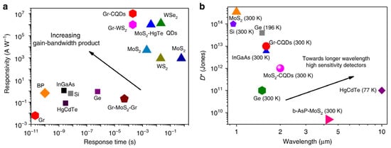 Responsivity (a) and detectivity (b) of 2D photodetector technologies and technologies currently in use [26].