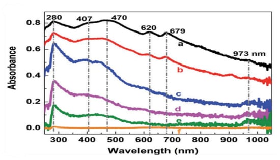 MoS2/GO heterostructures and nanocomposite materials make it possible to create structures with controlled absorption in a wide range from UV to IR, due to the formation of self-organizing MoS2 (Eg = 1.3–1.9 eV)/GO (Eg = 0–6 eV) heterostructures [27]. MoS2/rGO nanocomposites synthesized using preliminary ultrasonic treatment and a one-stage hydrothermal and reduction process are self-organizing MoS2 nanocrystals in a reduced GO (rGO) matrix [27]. The effect of quantum confinement in nanostructures controlled by the degree of reduction of graphene oxide and the size of graphene and MoS2 nanocrystals led to tunable optical absorption in a wide UV–IR wavelength range from 280 to 973 nm (Figure 9). Low-dimensional layered MoS2/rGO heterostructures have great potential for creating high-performance broadband photosensors.