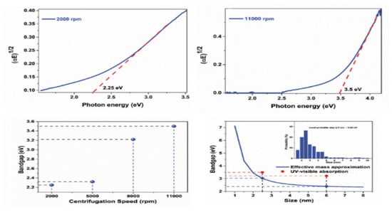 Dependences of (αhν)1/2 on hν for SnS2 QDs, obtained from the absorption spectra in the UV–visible range at 2000 (left, top) and 11,000 rpm (right, top). Band gap of quantum dots obtained from UV–visible spectra of SnS2 nanocrystals formed at different centrifugation speeds (left, bottom). Dependence of the band gap of the SnS2 QD on the QD size, obtained in the effective mass approximation (blue line), and the band gap obtained from the spectra in the UV–visible range (red spheres) (right, bottom). The inset shows the distribution of QD sizes obtained at a speed of 11,000 rpm and the QD band gap calculated from the effective mass approximation [28].