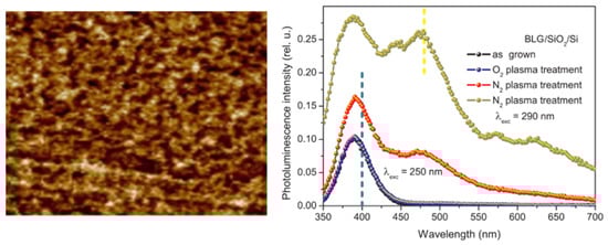 AFM image (left) of two graphene layers transferred onto a SiO2/Si substrate and processed in nitrogen plasma (scan size 600 × 600 nm2), and photoluminescence spectra (right) obtained by excitation of the resulting structure with light with λexc = 250 nm or 290 nm [29].