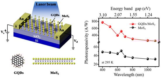 Schematic of the GQD/MoS2 hybrid device under optical illumination (left). The insets show the corresponding molecular structures of GQD (top view) and MoS2 (side view). Photosensitivity of hybrid GQD/MoS2 (red) and bare MoS2 devices (black) versus wavelength at fixed Vds = 10 V with laser wavelength varying from 400 to 1100 nm at room temperature (right) [31].
