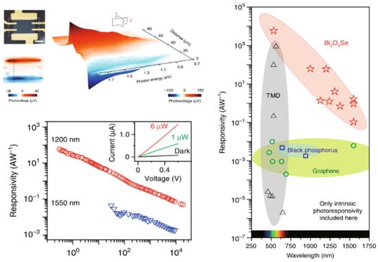 Many 2D materials exhibit high environmental and chemical resistance, ideal mechanical, electronic, and optical properties required for industrial applications [48,49,50,51,52,53]. Ideal infrared detectors have fast response times, high sensitivity, and environmental resistance, which are rarely found simultaneously in the same two-dimensional material. An ultrafast and highly sensitive IR photodetector based on a 2D Bi2O2Se crystal was recently demonstrated [45]. The photodetector showed a high responsivity of 65 A/W at a wavelength of 1.2 μm and an ultrafast photoresponse of ~1 ps at room temperature, which corresponds to a bandwidth limited by the material up to 500 GHz. Figure 14 shows the characteristics of a Bi2O2Se photosensor under a bias of 0.6 V for wavelengths of 1.2 and 1.5 μm. It can be seen that the photosensor demonstrates responsivity in a wide region of the visible–IR range from 500 to 1500 nm.