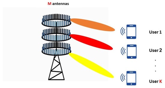 Recently, many enabling technologies such as massive MIMO [] have been introduced to support data rates beyond 5G (B5G) and sixth generation (6G) networks []. In mMIMO base station (BS) is equipped with a huge number of antennas, much larger than the number of serviced users [,]. mMIMO increases network capacity and data throughput by splitting data packets over multiple signal paths as well as allowing simultaneous multiple users by using multi-user MIMO (MU-MIMO). mMIMO is, therefore, an enhanced version of MU-MIMO, with advanced features such as increased spectrum efficacy and simplified signal processing, while MU-MIMO was used in the previous mobile generations due to its advantages over point-to-point MIMO, mMIMO is expected to be used in B5G and 6G due to its advantages over MU-MIMO [,].
