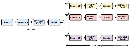 It is used for high data rate transmission over the communication system, where it also solves the problem of multipath and delay time for wireless communication. OFDM uses the multi-carrier to enhance the bandwidth efficiency and data rate []. In this work, we use OFDM under the different methods of implementation in FFT, DWT and FrFT. An OFDM transmitter and receiver can be described using the Inverse Discrete Fourier Transform (IDFT) and Discrete Fourier Transform (DFT) blocks [] and also the IFFT and FFT algorithms are then used to dramatically reduce the system’s complexity [,]. The transmitted signal data from the user represented as N point of IFFT: