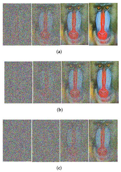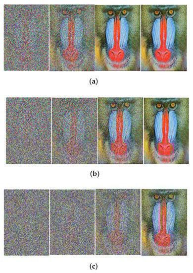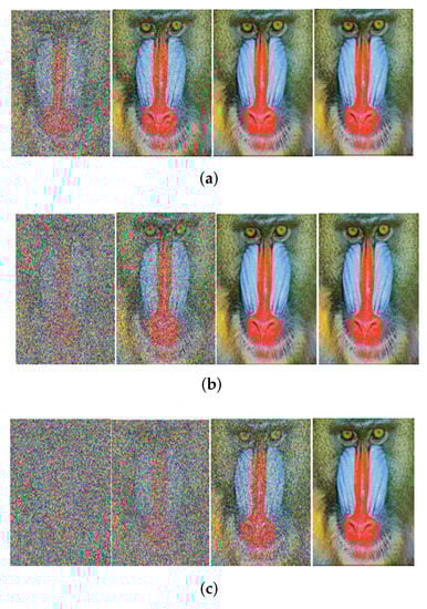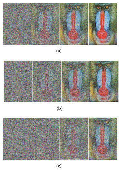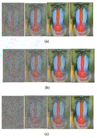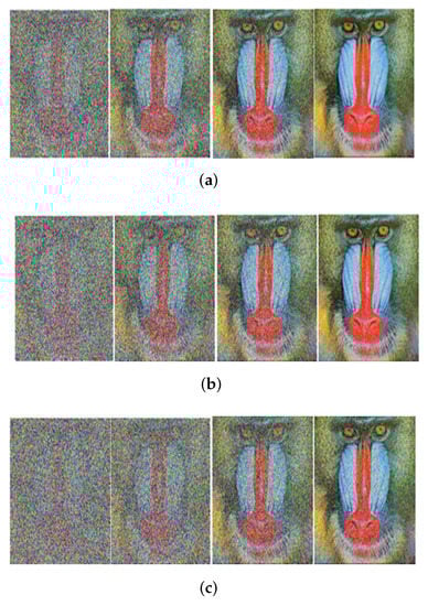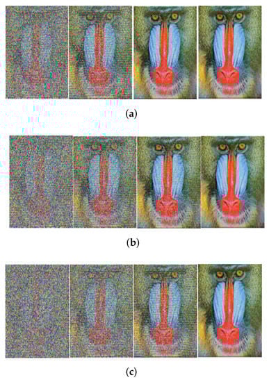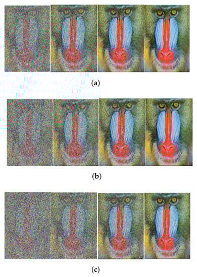 Received image with massive MIMO incorporated FRFT-OFDM over a Rayleigh channel, Modulated with 16-PSK and at SNR = 0, 10, 20, 30 dB from Left to Right for different number of users, n. (a) n = 10; (b) n = 20; (c) n = 50.