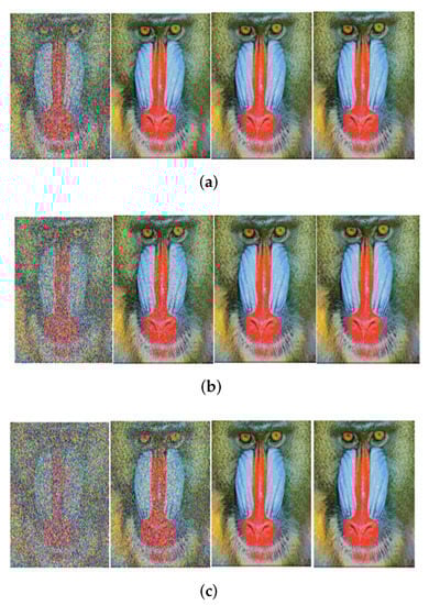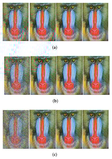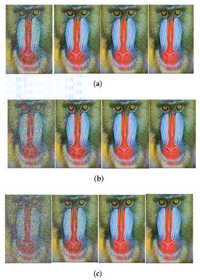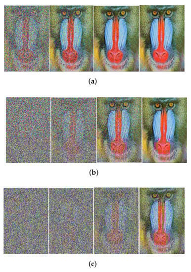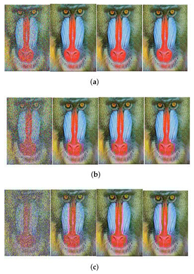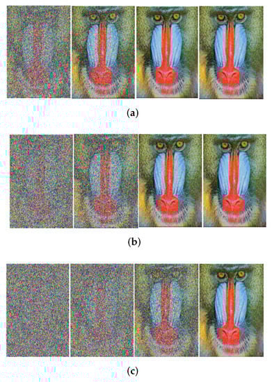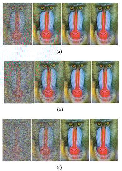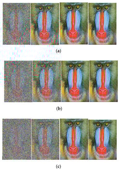 Received image with massive MIMO incorporated FRFT-OFDM over a Rayleigh channel, Modulated with BPSK and at SNR = 0, 10, 20, 30 dB from Left to Right for different number of users, n. (a) n = 10; (b) n = 20; (c) n = 50.