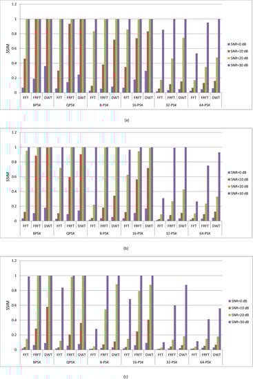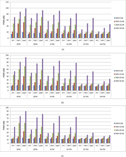 Furthermore, the comparison of Figure 4, Figure 5, Figure 6, Figure 7, Figure 8, Figure 9, Figure 10, Figure 11, Figure 12, Figure 13, Figure 14, Figure 15, Figure 16, Figure 17, Figure 18, Figure 19, Figure 20 and Figure 21 depict that for any modulation order, e.g., BPSK, the received image quality in case of DWT (i.e., Figure 16) is better than the received image quality in case of FRFT (i.e., Figure 10) and the received image quality in case of FRFT (i.e., Figure 10) is better than the received image quality in case of FFT (i.e., Figure 4). This fact is clearly demonstrated at low SNR values (i.e., SNR = 0 dB and SNR = 10 dB) and a large number of users (i.e., n = 50). However, at high order modulation (i.e., 64-PSK), this fact cannot be demonstrated pictorially; instead, PSNR and SSIM are used to examine the difference in the quality of the received signal, as will be illustrated in Figure 22 and Figure 23. The pictorial demonstration vindicates that fact for a particular modulation level and number of uses, the DWT-OFDM gives the best image quality at a particular SNR level.