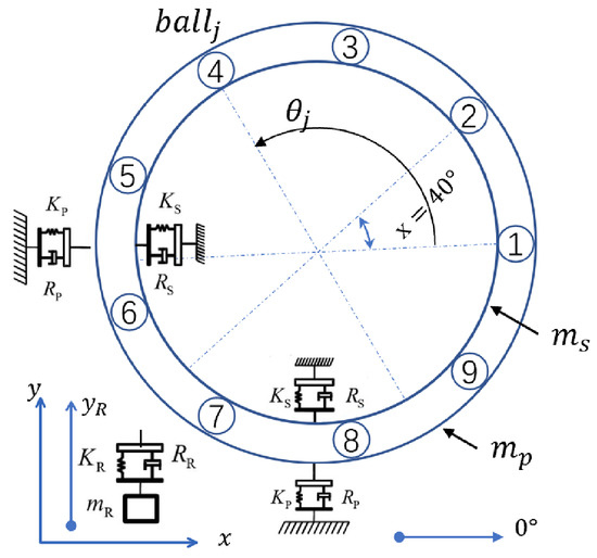 with j from 1 to , which represents the number of rolling elements. stands for the ball’s stiffness, denotes deformation. The deformation of the jth ball, , is determined by the displacement between the inner and outer races, the angular position and the total clearance c caused by the oil film and assembly clearance, as: