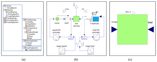 Bearing test bench in Modelica: (a) Component and module library; (b) Layout of virtual bearing test bench; (c) Interface of test bearing [15].