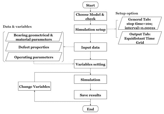 Figure 4 illustrates the procedure of simulation with the virtual bearing test bench in Modelica. Firstly, users need to choose one working sub-module from the healthy, raceway defect and ball defect bearing sub-modules for the test bearing and configure the simulation setups such as simulation time, interval and output format. Subsequently, all virtual bearing test bench parameters should be configured, including geometrical and material parameters, defect properties and operating parameters. The last step is to run the simulation and obtain the results.