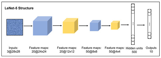 LeNet-5 is one of the most frequently used CNN structures. It consists of two sets of convolutional and pooling layers, one flattening layer, two fully-connected layers and one softmax classifier. In this research, it is slightly modified for bearing fault classification. The modified structure is sketched in Figure 6.