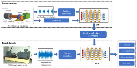 As analyzed in the introduction section, sufficient training data are the precondition for data-driven fault diagnosis. Moreover, the training and test sets should belong to the same domain. Otherwise, the accuracy cannot be guaranteed even when the network is trained with enough data from the domain different from the target one. Transfer learning is proposed to solve the network performance reduction when involved across domains. Lei et al. summarized the reported transfer learning methods into four categories [21], like feature-based [22,23], GAN-based [24,25], instance-based [26], and parameter-based [27]. In these published researches, the domain-invariant feature extraction and space alignment should be addressed, either by maximum mean discrepancy constraints or network training or parameter fine-tuning, which is complex and not feasible in industry applications. Essentially, there are two main steps in CNN-based fault diagnosis: feature extraction and feature-label mapping identification. Though the simulation and experiment data come from two different domains, the inevitable differences may arise between them due to the modeling error and some unavailable geometry parameters or parameter identification errors. Nevertheless, there are still some shared features like fault characteristic frequency. Therefore, this research explores whether it is possible to train the CNN with simulation data and part experiment data and then transfer the well-trained CNN to realize the fault diagnosis for a real test bench. Figure 8 demonstrates the procedure of direct transfer learning from the virtual bearing test bench to the Case Western Reserve University bearing test bench.