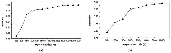 In the case of A, an increasing number of experimental bearing data is used to train the CNN and then tested under the fixed test set. Here, we must mention that the classification accuracy, i.e., the y axis in figures, refers to the average accuracy of 20 experiment times under the test set. For example, in Figure 9, the ‘25e’ in the x-axis means the CNN is trained with 25 sets of experimental data, and others are in the same manner. As can be seen from Figure 9a,b, the CNN classification accuracy increases with the number of experimental data. Moreover, with the increasing experiment data being fed to train CNN, the CNN classification accuracy rises sharply at first and then slowly. It can be explained as follows: at first, more training data means more information, and more information promotes the CNN to extract more hidden features and enhance the classification accuracy. However, when the training data increase further, most information from the samples is repeated, and only very little new information will be brought in.