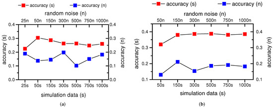 In the case of B, an increasing number of simulation data is used to train the CNN, and random noise with the same size is also used for CNN training as the contrast. The results are presented in Figure 10, where the ‘25s’ in the x-axis means the CNN is trained with 25 sets of simulation data, and ‘25n’ means the CNN is trained with 25 sets of random noise. As shown in Figure 10, when only simulation data are used as the training data, the CNN classification accuracy is relatively low either for the fault size of 0.021 inches (a) or 0.014 inches (b), but it is still much better than using the random noise. This demonstrates that the simulation data from the bearing dynamics model contains some bearing fault information that the random noise does not have and then contributes to the CNN’s fault diagnosis performance. However, we can find that the classification accuracy does not increase when using more simulation data to train the CNN with further analysis. In Figure 10a, the accuracy rises when the training data increases from 25 sets to 50 sets, and then it even reduces a little bit; In Figure 10b, with increasing simulation data added to the training set, the accuracy increases at first and then fluctuates around the accuracy peak value. Under both two fault sizes, the CNN reaches the accuracy peak values much faster than the CNN trained with experimental data in Figure 9a,b. This is because the bearing fault information in the simulation data are not as abundant as that in experimental data. Moreover, the experimental data also contain process and measurement noise that the dynamics model does not address. Therefore, we can find that only using simulation data as the training data is not feasible with the above results. Thus, employing the simulation data as auxiliary of experiment data to train CNN will be explored and compared in the following cases.