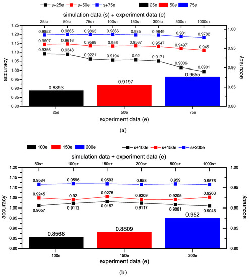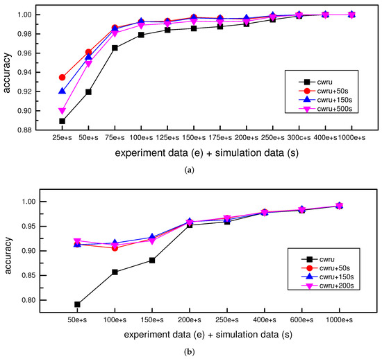 In contrast to case C, in the case of D, the sample size of experiment data is fixed at certain values (25 sets, 50 sets, 75 sets) and then added to an increasing number of simulation data to train the CNN. Figure 12 gives the results. The legend ‘s+25e’ refers to the CNN trained with 25 sets of experimental data and increasing simulation data. At the same time, the ‘25e’ means the CNN trained with only 25 sets of experiment data (like case A). The other legends are denoted in the same way. As can be seen from Figure 12, when simulation data are added to the experiment data, the CNN classification accuracy is always higher than that from the CNN only trained with experiment data, no matter whether it is 25 sets, 50 sets or 75 sets. These results verify that simulation data as the auxiliary experiment data can improve CNN’s fault classification accuracy. However, the accuracy does not increase as the sample size of simulation data grows, which can be explained as the bearing fault information in the simulation data is relatively repetitive. In short, an appropriate number of simulation data can partly supplement the bearing fault information when experiment data is insufficient. When simulation data are far more than experiment data, it may mislead the classification. That is to say, using simulation data as the auxiliary of experiment data is a more feasible way. With results in Figure 12a,b, the same conclusion can be reached.