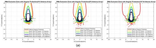 Similar to the case of the exclusion zone with angular protection, more antenna array elements lead to more effective angular protection. Without angular protection, the restriction zone of the 8 × 8 and 16 × 16 arrays is larger than that of the 4 × 4 array. However, when the beam shut-off range is set to 45° or higher, the restriction zones of the 8 × 8 and 16 × 16 arrays become smaller than that of the 4 × 4 array.