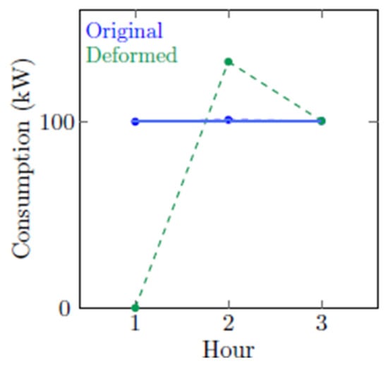 A normalized deformation profile will be applied, with an action segment of 100% reduction and a reaction segment of 30% increasing (see Figure 2). We can either apply this deformation starting from the first or second period. If we use it during the first period, the consumption is first reduced by 100%, which causes a drop of 100 kW in consumption. Afterward, the second part will catch up to 30% of the lost power so that the customer will consume an extra 30 kW during the second period. The resulting consumption of the customer is thus (0 kW; 135 kW; 103 kW) asillustrated in Figure 3. Similarly, if weapply it during the second period, the consumption would be (100 kW; 0 kW; 134.5 kW) as illustrated in Figure 4.