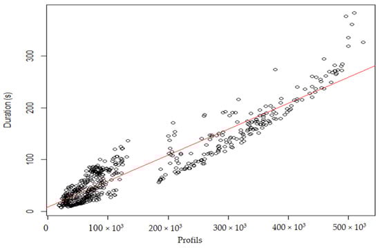 Evolution of execution time depending on the size of the problem. The red line gives a linear regression based on this results.