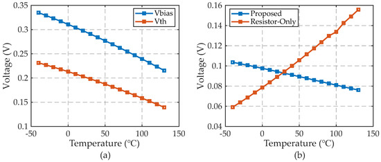 Figure 4 shows the threshold voltage and bias voltage of the core MOS according to temperature change. The proposed load model in Figure 3a applied to the structure of this paper and the resistor-only load model as shown in the same figure were compared and plotted. The resistance value of the resistor-only model was set to have the same bias voltage as the proposed model at 27 °C. Figure 4b compares the overdrive voltage of the Core MOS of the two models. When −40 °C and 125 °C are compared, the amount of change of the overdrive voltage in the proposed model is 26.76 mV, whereas the amount of change in the overdrive voltage of the resistor only model is 92.94 mV. In the case of the proposed model, the amount of change in overdrive voltage was reduced by 71%.
